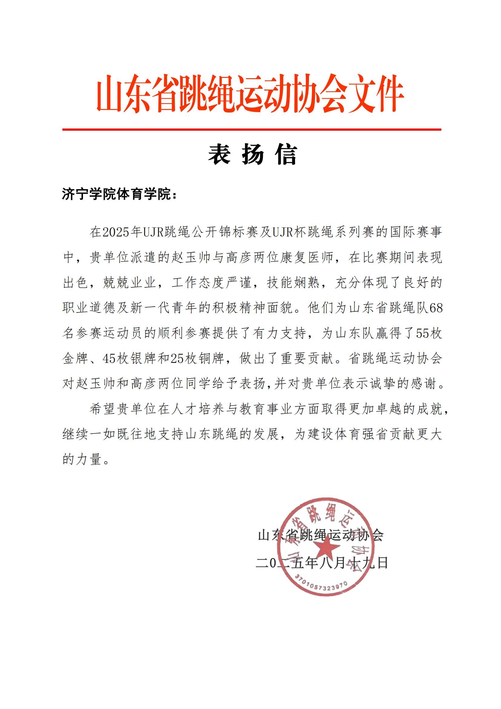 山东省跳绳运动协会在表扬中,不仅对赵玉帅和高彦两位同学的出色表现给予了高度肯定,还向多宝平台体育学院表达了诚挚的感谢。协会同时希望我校体育学院在人才培养与教育事业上能够取得更卓越的成就,继续支持山东跳绳事业的发展,为建设体育强省贡献更大的力量。