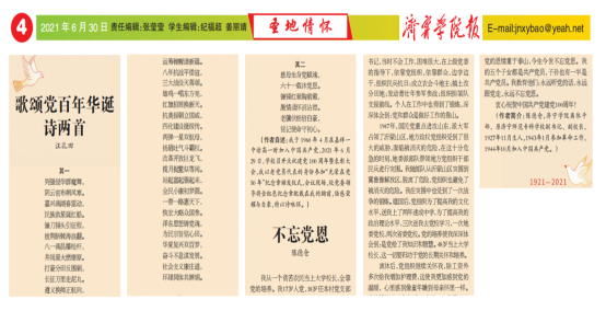 老同志们的亲身经历是党史国史生动具体的反映,是党史学习教育丰富的营养剂。1944年入党的离休干部陈德仓的回忆短文《不忘党恩》和1960年在高中时期入党的老党员汪孔田撰写的《歌颂党百年华诞诗两首》在《多宝平台报》的刊登,激发了广大师生对党、对祖国、对中国特色社会主义的无比热爱,提高了学校党史学习教育实效。