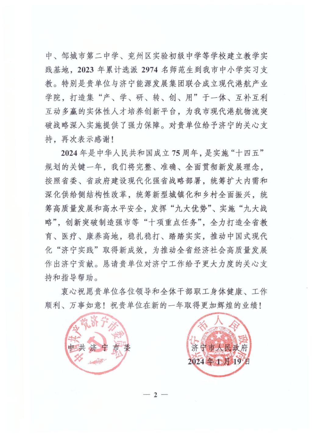 济宁市委、市政府的来信是对我校服务地方经济社会发展工作的充分肯定。2024年,我校将紧紧围绕建设高质量应用型大学的办学定位,锚定“1385”发展战略,统筹教育、科技、人才一体化发展,推进学科、平台、团队一体化建设,主动对接济宁市“九大战略”“十项重点任务”,持续优化学科专业布局,深化产教融合,提升应用型人才培养质量和服务区域产业发展能力,助力济宁经济社会高质量发展。