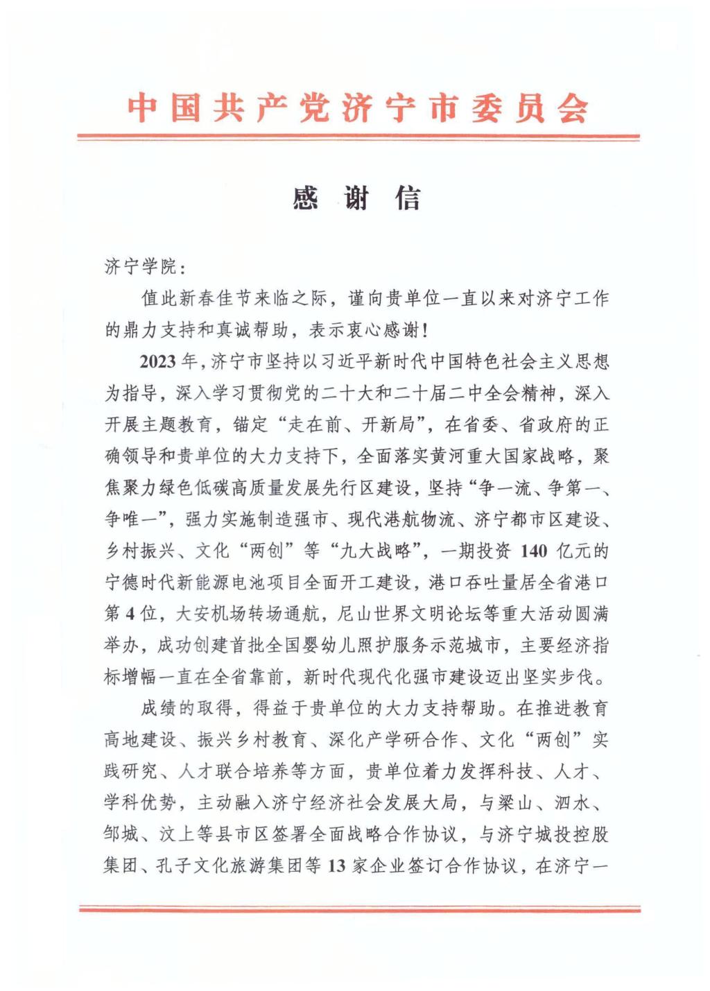 近日,济宁市委、市政府向我校发来感谢信,对我校一直以来对济宁工作的支持和帮助表示感谢。