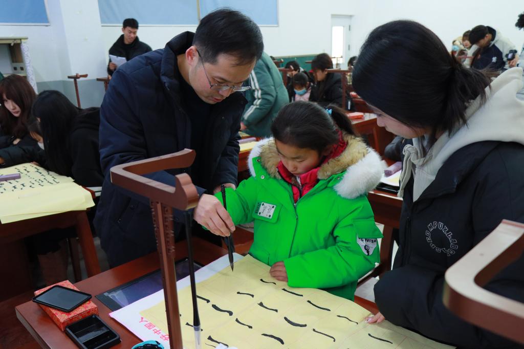 田树森介绍了“写好中国字 做好中国人”公益项目。杨殿生和张继华共同为济宁市困境儿童美育教育实践基地揭牌。揭牌仪式后,全体人员前往美术馆参观书画展。张胜利带领美术学院学生志愿者共同为前来参加本次活动的少年儿童代表上了一节生动有趣的书写“福”字书法体验课。