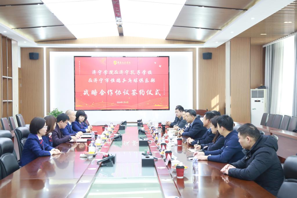 1月4日,我校与济宁孔子学校、济宁市恒瑞乒乓球俱乐部签署战略合作协议,多宝平台党委副书记、校长王清明,党委委员、副校长尹春光,济宁市体育局党组书记、局长班建新,济宁高新区发展软环境保障局副局长、教体处处长邱爽,济宁孔子学校校长沈建华,济宁市恒瑞乒乓球俱乐部董事长涂恒瑞,多宝平台教务处(教师教学发展中心)、体育学院负责同志参加活动。活动由济宁孔子学校校长沈建华主持。