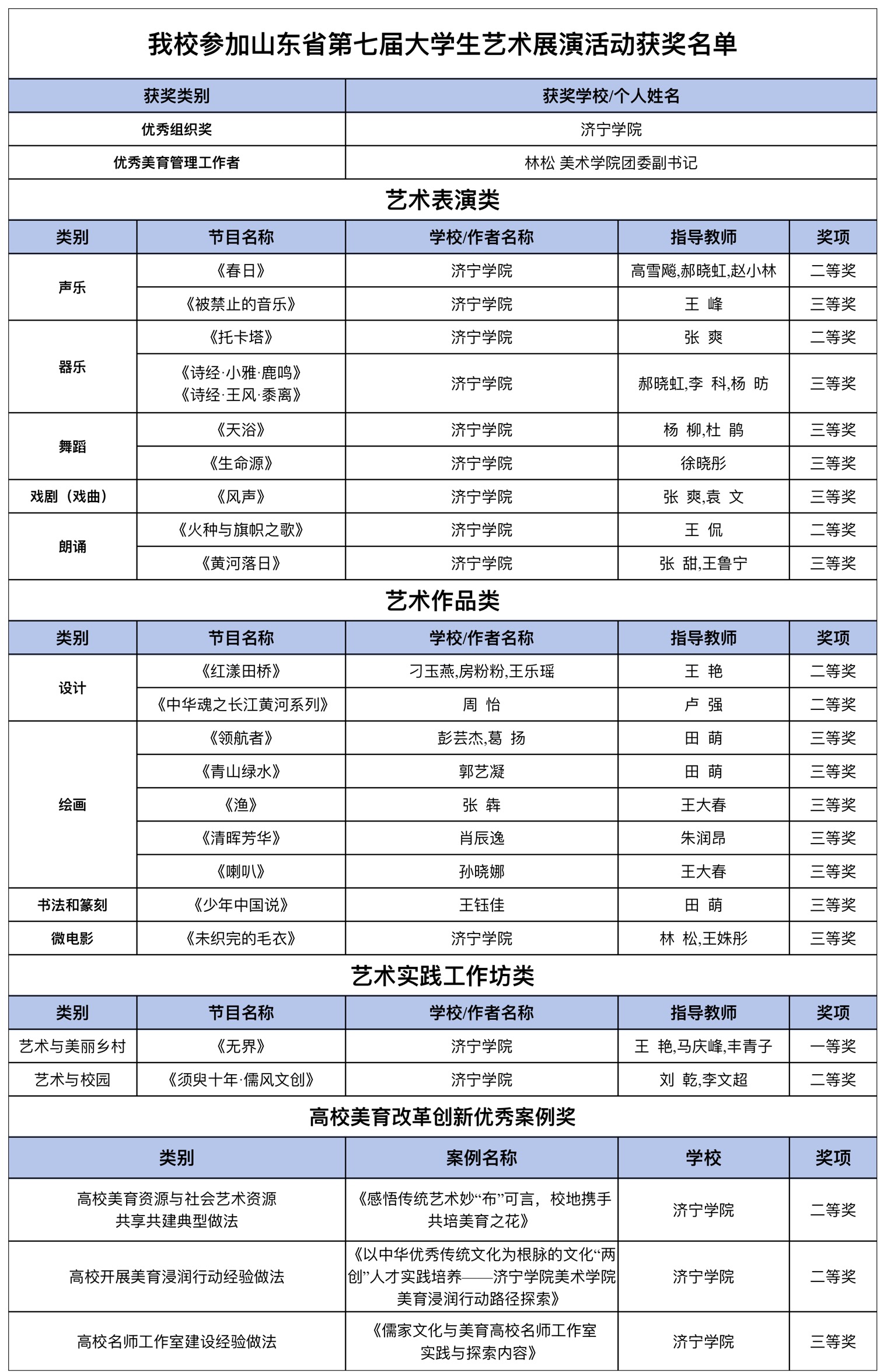 近日,山东省第七届大学生艺术展演活动评选结果揭晓,学校在本次展演活动中荣获25个奖项,以优异成绩圆满完成此次大赛。其中艺术表演类二等奖3项,三等奖6项;艺术作品类二等奖2项,三等奖7项;艺术实践工作坊一等奖1项,二等奖1项;高校美育改革创新优秀案例二等奖2项,三等奖1项;1名教师获评“优秀美育管理工作者”,学校获评“优秀组织奖”。