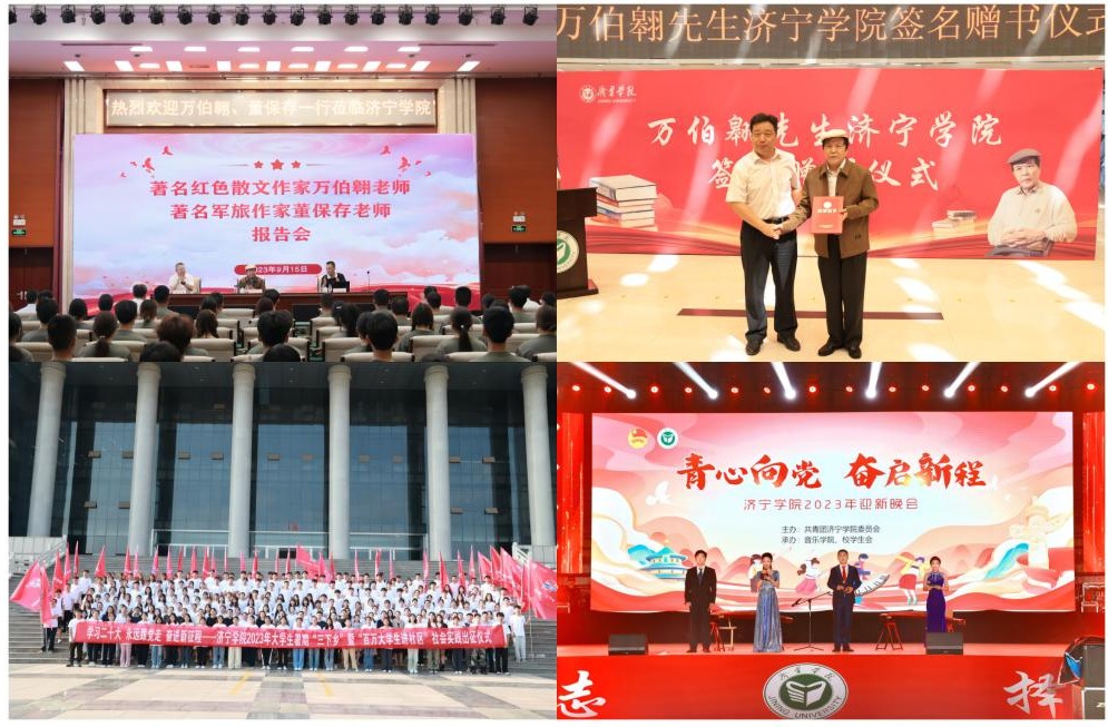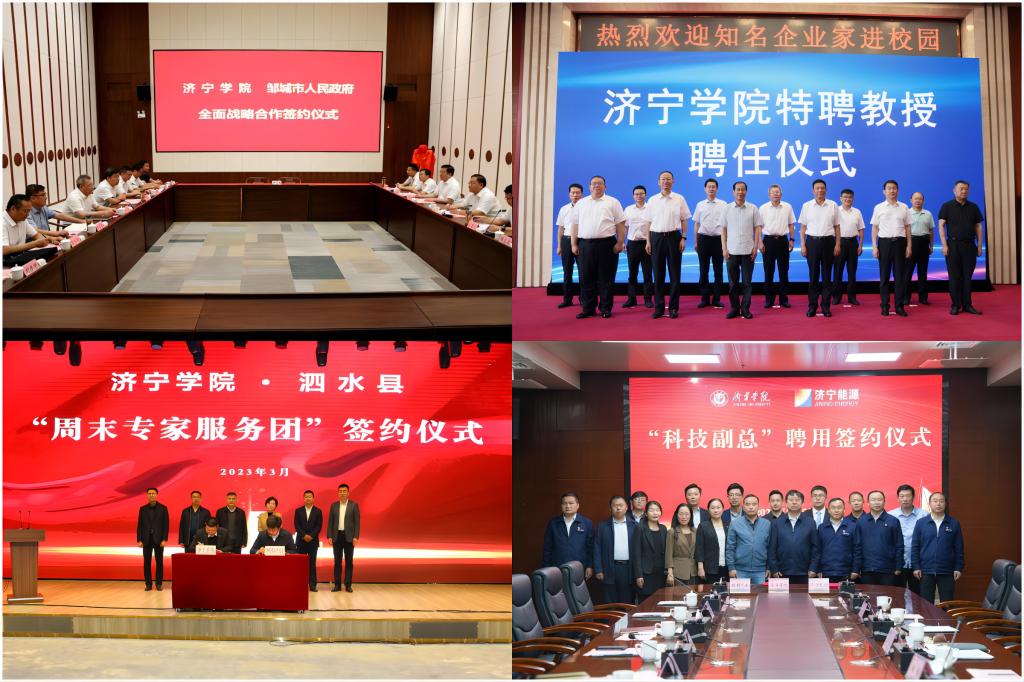 与兖州区、曲阜市、邹城市、梁山县、汶上县、巨野县等地方政府和中国广电山东公司、浪潮软件、济宁联通、东宏集团等企业建立战略合作关系,与企事业单位签订技术合同400余项,在济宁经开区建设科技成果转化基地。开展优秀企业家进校园活动,聘任济宁能源党委书记、董事长张广宇等8位济宁市知名企业家为我校特聘教授。选派136人到企事业单位挂职锻炼,选派20名博士到企业挂职科技副总,组织33支专家服务团和党外知识分子到企业开展考察调研。承接国培、省培等各类培训项目10余项,累计培训6000余人次。外国语学院顺利完成济宁市代表团中亚三国行随团翻译工作。体育学院圆满完成济宁市89所学校学生体质健康抽查复核工作。团委组织269名志愿者高质量完成国际孔子文化节、尼山世界文明论坛志愿服务工作。音乐学院340余名师生以扎实的专业素养出色完成了世界互联网大会数字文明尼山对话、国际孔子文化节祭孔大典演出任务,受到多方表扬与肯定。学校被济宁市委、市政府授予“支持济宁发展突出贡献单位”。