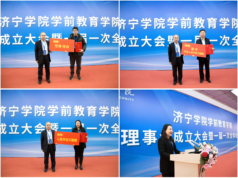 随后,夏可树主持理事单位捐赠仪式。他宣读捐赠项目:兖州区高阳书法培训学校捐赠空调10台,兖州区锦未来教育集团捐赠人民币5万元,优秀校友代表郝文林捐赠价值10万元图书。兖州区锦未来教育集团董事长曹洪艳代表18家理事单位发表讲话。