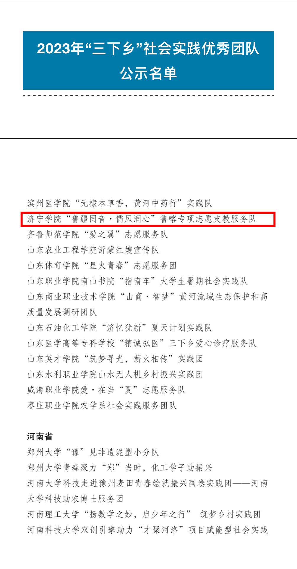 近日,共青团中央对2023年全国大中专学生志愿者暑期文化科技卫生“三下乡”社会实践活动进行总结表彰,我校人文与传播学院“鲁疆同音·儒风润心”鲁喀专项志愿支教服务队获评“三下乡”社会实践“优秀团队”。