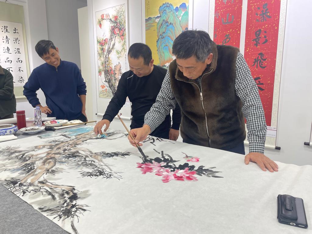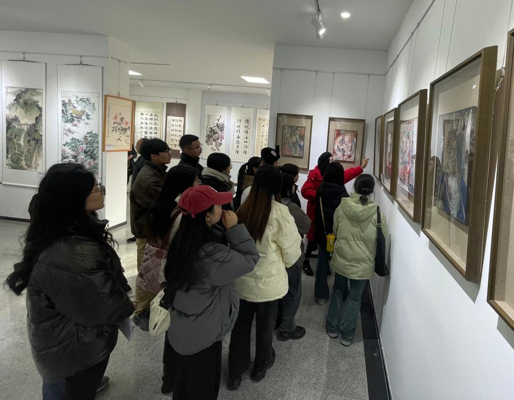 现场教学环节,师生共同参观了正在展出的“纪念习近平总书记视察曲阜十周年——全国书画名家作品展”。本次展览,书法作品篆、隶、行、楷、草五体咸集,条幅、对联、诗词、集句等形式皆有,绘画作品或赞美万里江山,或聚焦百姓生活,或浓墨重彩,或刻画入微,幅幅技法娴熟,墨韵传神。参观结束后,在场教师与当地艺术家开展了“丹青颂盛世——笔会”活动,共同创作了一幅名为《儒韵风华》的国画作品。