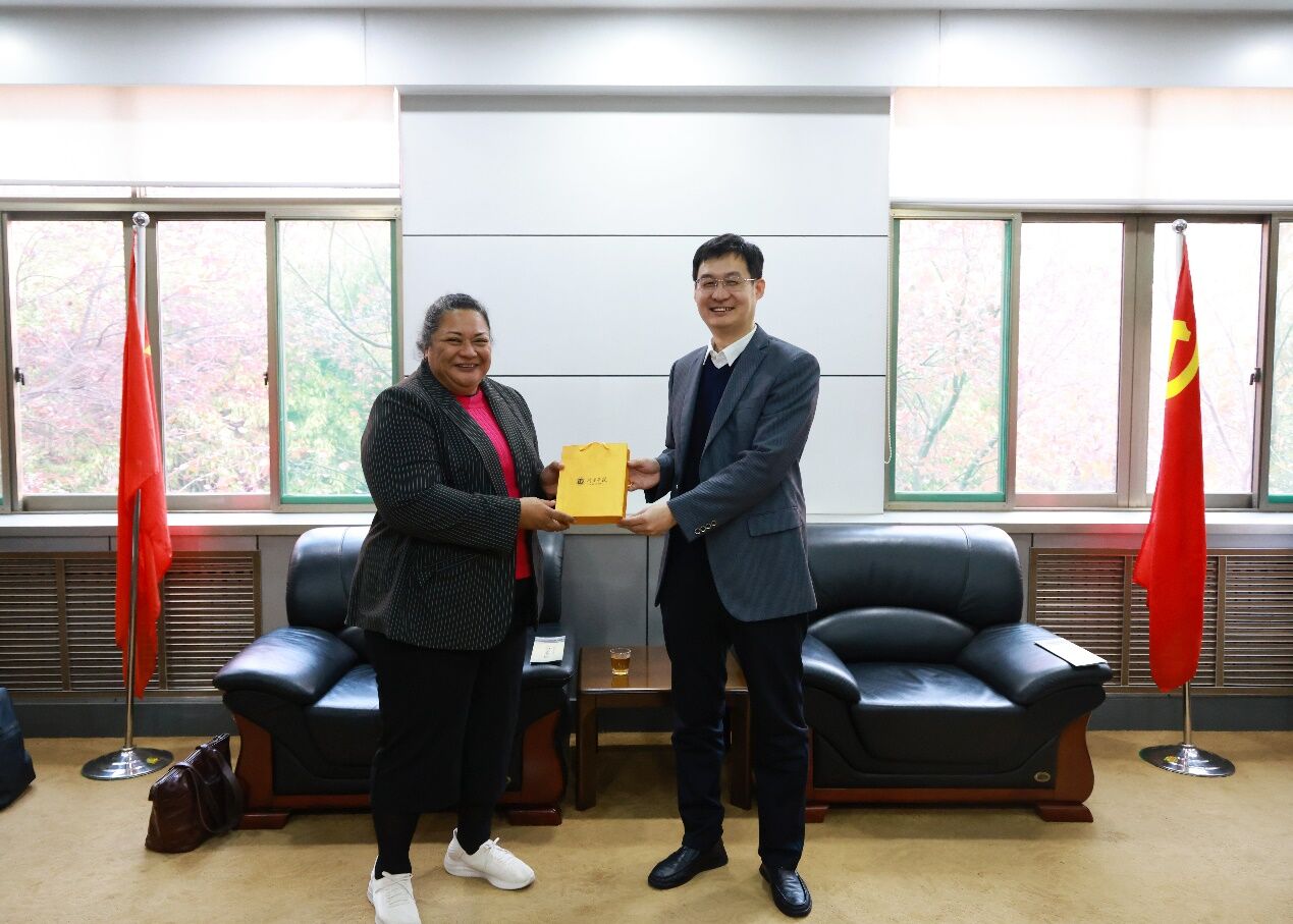 赵明首先代表学校对萨摩亚国立大学代表团的到来表示热烈欢迎,介绍了学校办学历史、学科专业、办学特色和国际合作等方面的情况,希望双方能够加深沟通了解,加强交流合作。随后,赵明向客人赠送了学校纪念品。Louise Marie Matata Milo教授感谢学校的热情接待,介绍了萨摩亚国立大学的基本概况、学科专业和特色学科,希望双方能开展交流合作。陈万会教授介绍了聊城大学孔子学院办学经验和建设情况。