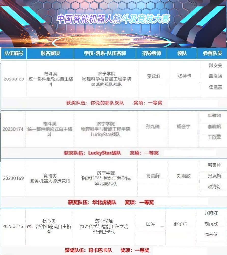 近日,“2023中国机器人大赛暨RoboCup机器人世界杯中国赛”和“2023中国智能机器人格斗及竞技大赛”决赛成绩发布,我校物理科学与智能工程学院学生在2023中国机器人大赛暨RoboCup机器人世界杯中国赛“武术擂台赛-视觉挑战赛”中获全国二等奖1项;在中国智能机器人格斗及竞技大赛的“服务机器人搬运竞技” 、“统一部件组轮式自主格斗”、“智能机器人创新设计比赛”赛项中获全国一等奖4项、二等奖4项、三等奖10项。