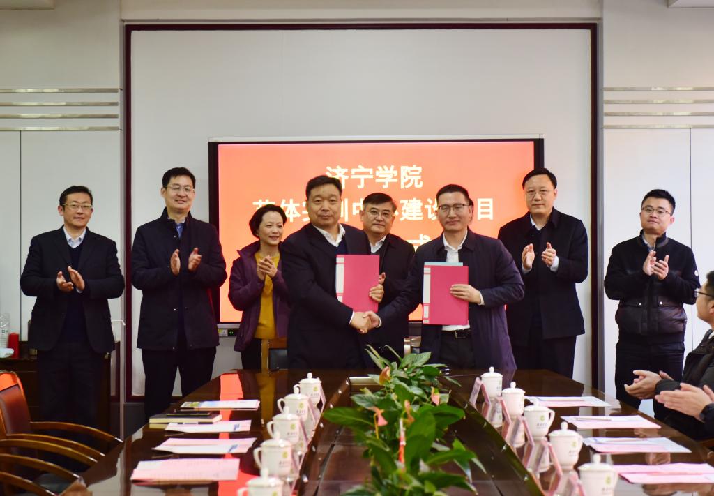 ▲党委副书记、校长王清明,中建八局一公司鲁南公司总经理魏书圣共同签署协议书