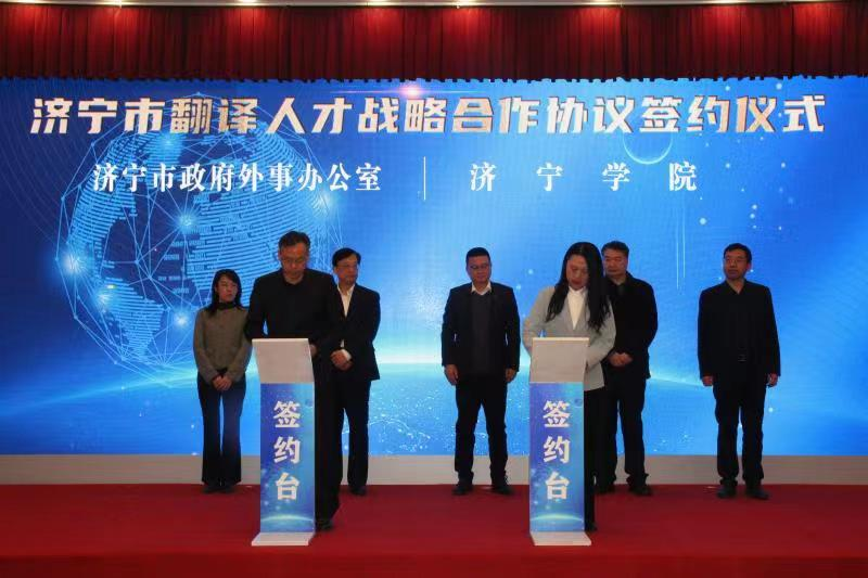 济宁市政府副市长张东、省外事翻译中心主任姜云云等出席仪式。仪式由市政府外事办公室党组书记、主任王昌贯主持,外国语学院副院长张颖代表多宝平台与市外办签署了翻译人才战略合作协议。