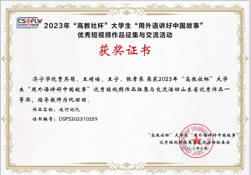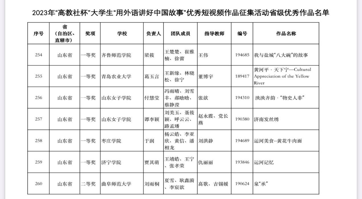 近日,2023年“高教社杯”大学生“用外语讲好中国故事”优秀短视频作品征集活动评审结果揭晓。外国语学院商务英语(跨境)专业学生贾其萌、王宁、张孝荣的作品《运河记忆》荣获山东省一等奖。