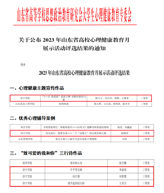 近日,2023年山东省高校心理健康教育月展示活动评选结果揭晓,我校共有5项作品获奖,其中二等奖1项、三等奖4项。胡习习、刘小玲等创作的《“5·25 我爱我”桌面立牌 诠释治愈的力量》荣获心理健康主题宣传作品二等奖;赵杨洋撰写的《向光而行,筑梦未来——一个“边缘人”的自我实现之路》荣获优秀心理辅导案例三等奖;李淑贤创作的《不平等交换》、刘智慧创作的《向日葵》和王昊月创作的《请升起你的太阳》分别荣获“致可爱的我和你”三行诗作品三等奖。
