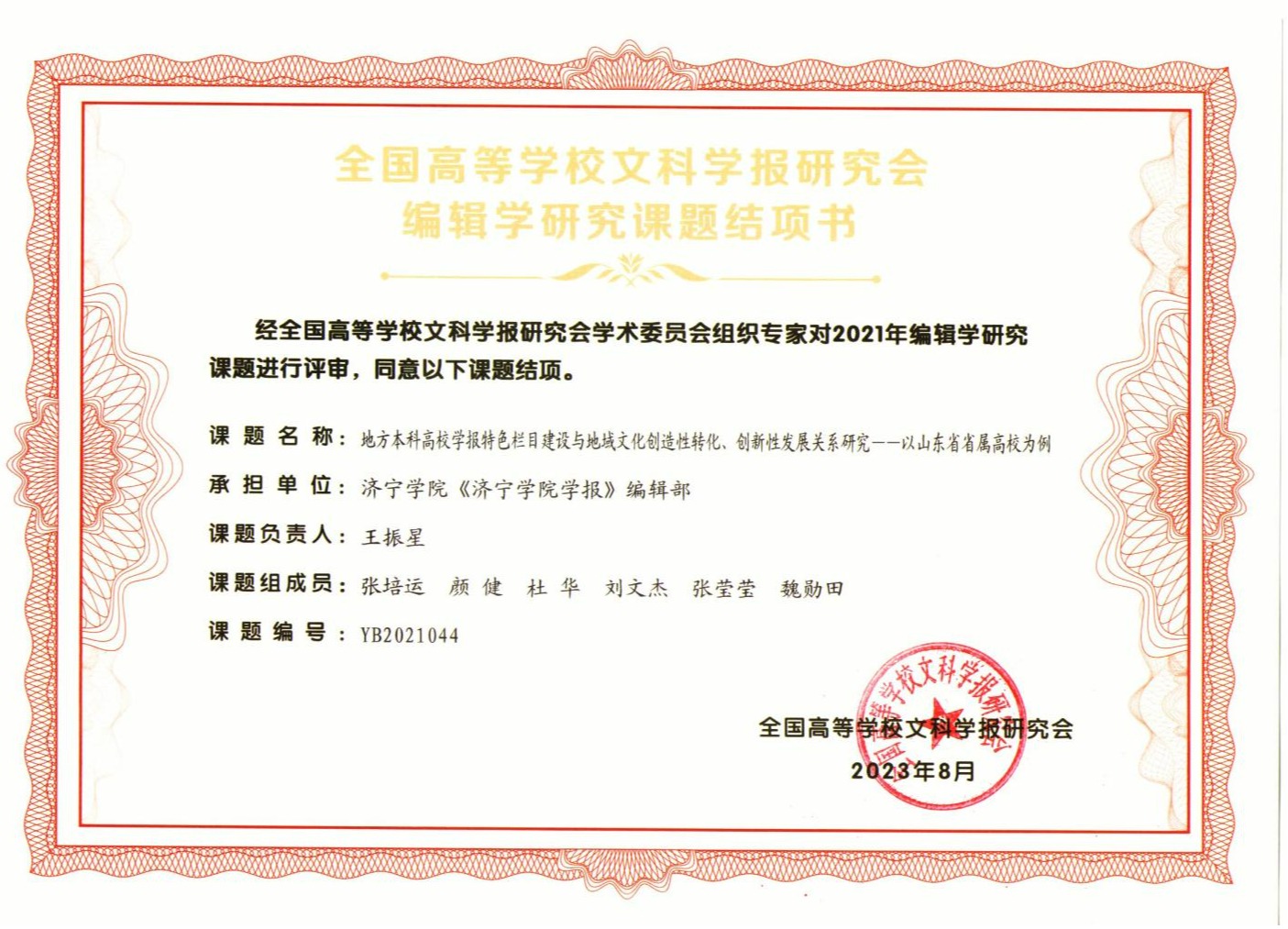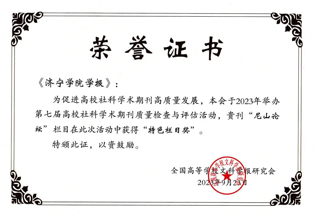 近日,经教育部社科司批准、由全国高校文科学报研究会组织实施的“第七届全国高校学术期刊质量检查与评估”结果揭晓,《多宝平台学报》“尼山论坛”栏目荣获“特色栏目奖”。这是继1999年我校学报荣获“首届全国优秀社科学报”奖后首次获得特色栏目类奖项,对提高学报学术质量、彰显办刊特色、扩大学术影响、服务学校教学科研、助力我校高水平应用型高校建设,具有积极的推动和激励作用。