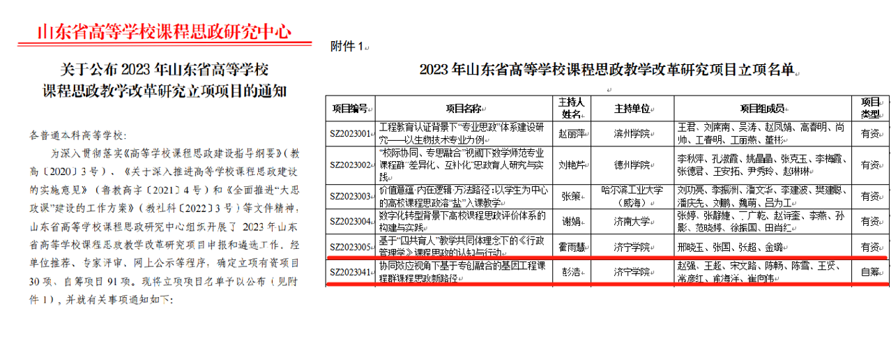 近日,山东省高等学校课程思政研究中心公布了2023年山东省高等学校课程思政教学改革研究项目名单,儒商学院霍雨慧主持课题“基于‘四共育人’教学共同体理念下的《行政管理学》课程思政的认知与行动”、生命科学与生物工程学院彭浩主持课题“协同效应视角下基于专创融合的基因工程课程群课程思政新路径”获批立项,其中“基于‘四共育人’教学共同体理念下的《行政管理学》课程思政的认知与行动”获得了三万元资金支持。