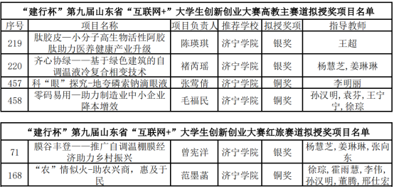 本次比赛由省教育厅、省委网信办、团省委等省直部门单位共同主办,共有来自全省231所学校的50.16万个项目报名参赛,参赛人数达79.5万。大赛启动以来,学校高度重视,组织动员全校师生积极广泛报名,报名参赛项目5430项,累计参赛学生22094人次。经过初赛、复赛的激烈角逐,我校生命科学与生物工程学院《肽胶皮—小分子高生物活性阿胶肽助力医养健康产业升级》和化学化工与材料学院《膜谷丰登》、《齐心协绿—基于绿色建筑的自调温液冷复合相变技术》三个项目获省赛银奖,生命科学与生物工程学院《科“眼”探究——地夸磷索钠滴眼液》和儒商学院《“农”情似火-助农兴商,惠及于民》、《零码易用—助力制造业中小企业降本增效》三个项目获省赛铜奖。