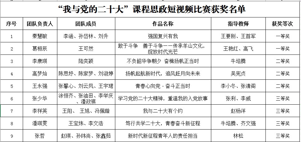 近日,由山东省教育厅高等教育处指导、山东省高等学校课程思政研究中心主办的“我与党的二十大”课程思政短视频比赛结果公布,我校共选拔推荐10个作品参赛,最终获得一等奖2项、二等奖3项、三等奖4项。
