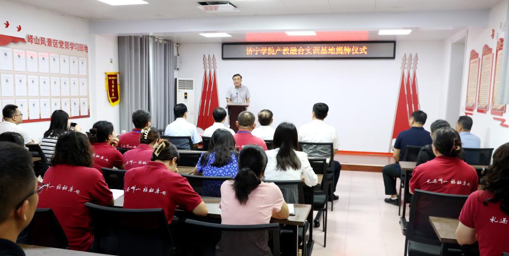 仪式上,丰家雷介绍了学校的发展历史及服务济宁区域经济社会发展的办学理念。他指出,峄山风景区拥有丰富的自然资源、文化资源、产业资源,这些资源的传承与发展和学校多个学科专业契合度高,合作空间大。今天,产教融合实训基地揭牌仪式的举行,凸显了学校和地方之间的公共利益和共同目标,是校地深度融合、共赢发展的新起点。希望双方以此次活动为契机,在促进旅游宣传与教学实践融合、实现旅游发展与学术科研共赢方面进行积极探索,助推峄山风景区旅游高质量建设、可持续发展,实现双方互利共赢。