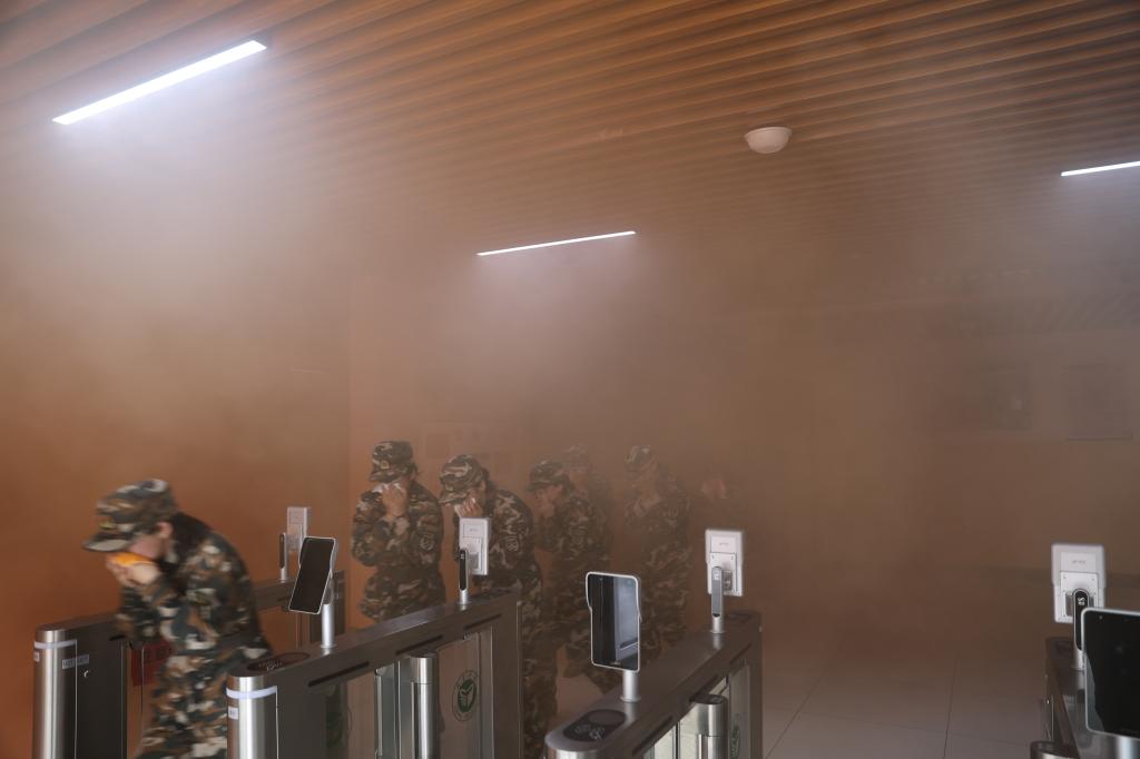 10点30分,安全保卫处副处长申建民宣布防火疏散演练开始,副处长李和平对活动进行了具体安排。新7B宿舍楼浓烟弥漫,紧急启动防火疏散演练。楼内各疏散口、楼梯口等重点区域的引导员迅速就位,引导学生使用湿毛巾捂住口鼻,弯腰低姿态沿疏散标识所示方向有序完成疏散。整个演练过程紧张有序,全部师生安全撤离,圆满实现预期目标。