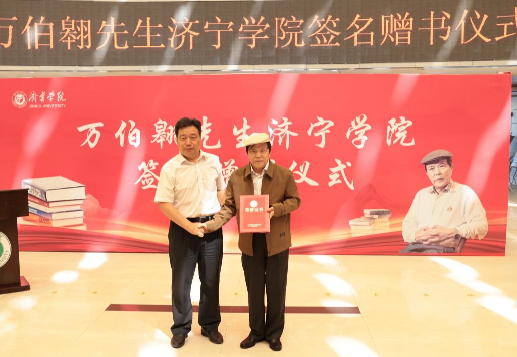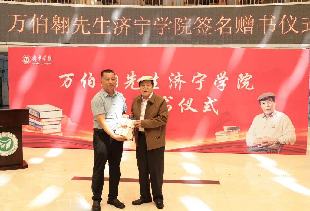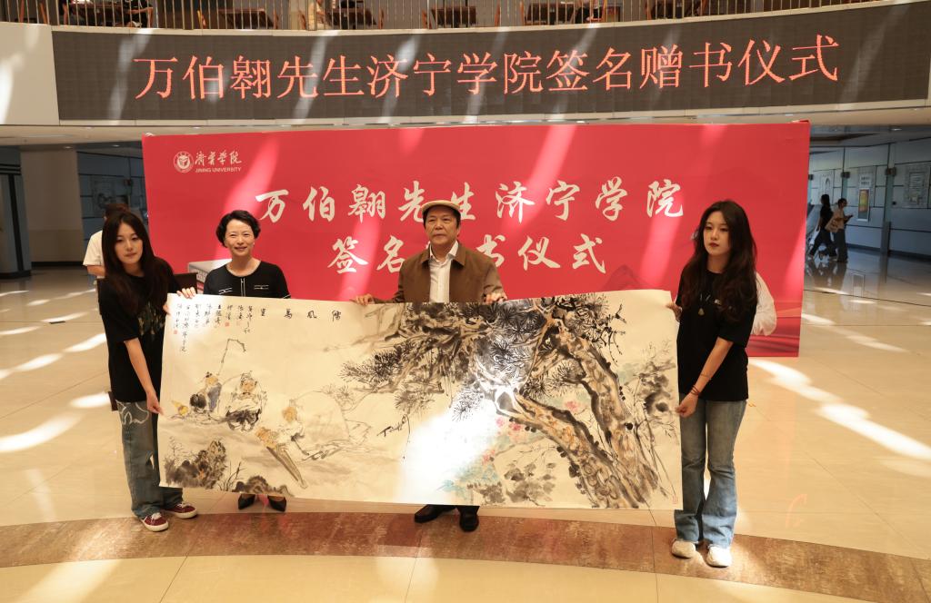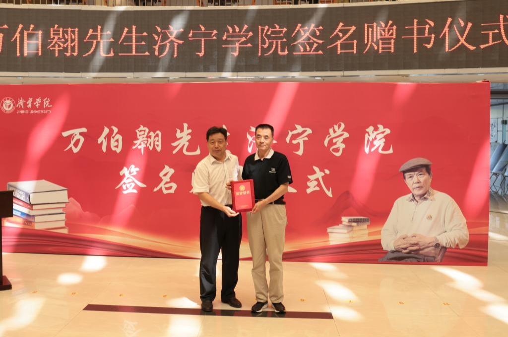 随后,万伯翱先生向我校图书馆、济宁市图书馆、曲阜市图书馆捐赠了《万里文选》《红墙内外》《五十春秋》《六十春秋》《七十春秋》《万伯翱画传》《纵谈梨园春秋》《名人垂钓记》《元戎百姓共垂竿》及《万里》画册。董保存先生向我校图书馆捐赠了《余秋里传》《英雄赞歌——健在的抗美援朝老英雄写真》《涅槃——北京动批30年》等图书。捐赠现场,万伯翱先生为学校亲笔题词“弘扬万里精神 培养优秀人才”“博学笃志 择善敦行”。