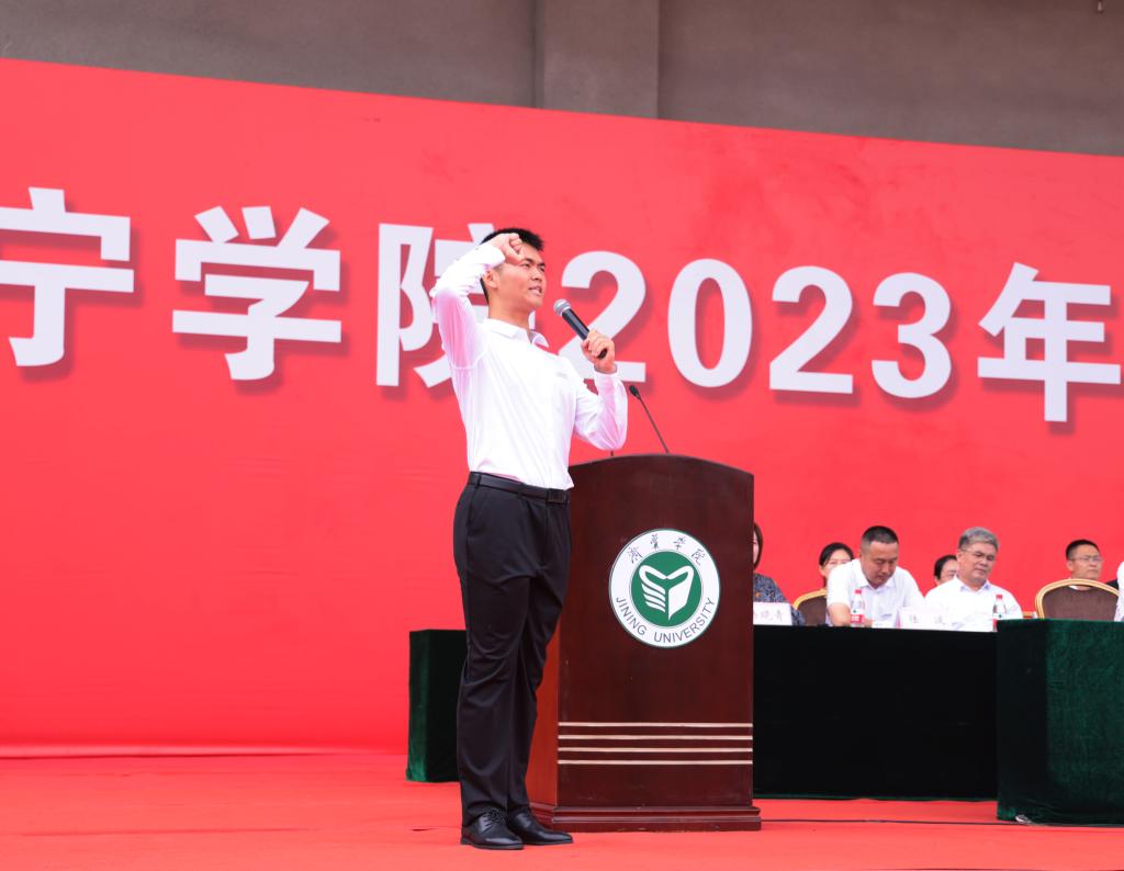 学校领导为新生代表佩戴校徽后,在新生代表谷宇翔带领下,全体新生郑重宣誓:秉承“博学笃志、择善敦行”校训,弘扬“至诚至朴、求是求新”校风,努力成为具有坚定信念、高尚情操、专业知识、应用能力、“双创”意识、数字素养、健全人格、健康体魄、儒家文化特质鲜明的高素质应用型人才,为实现中华民族伟大复兴贡献青春力量!请党放心、强国有我!
