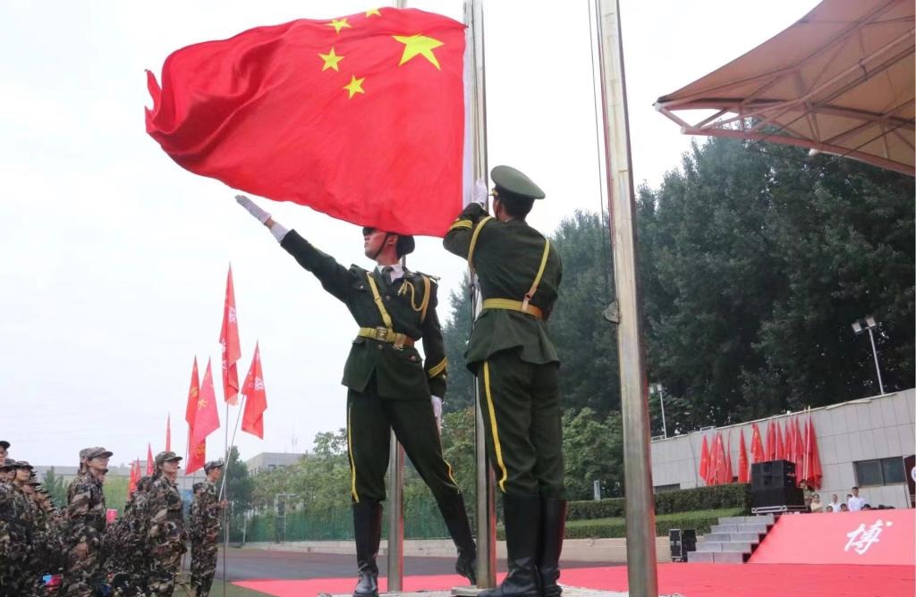 ▲党委书记杨天梅为“多宝平台2023级学生军训团”授旗