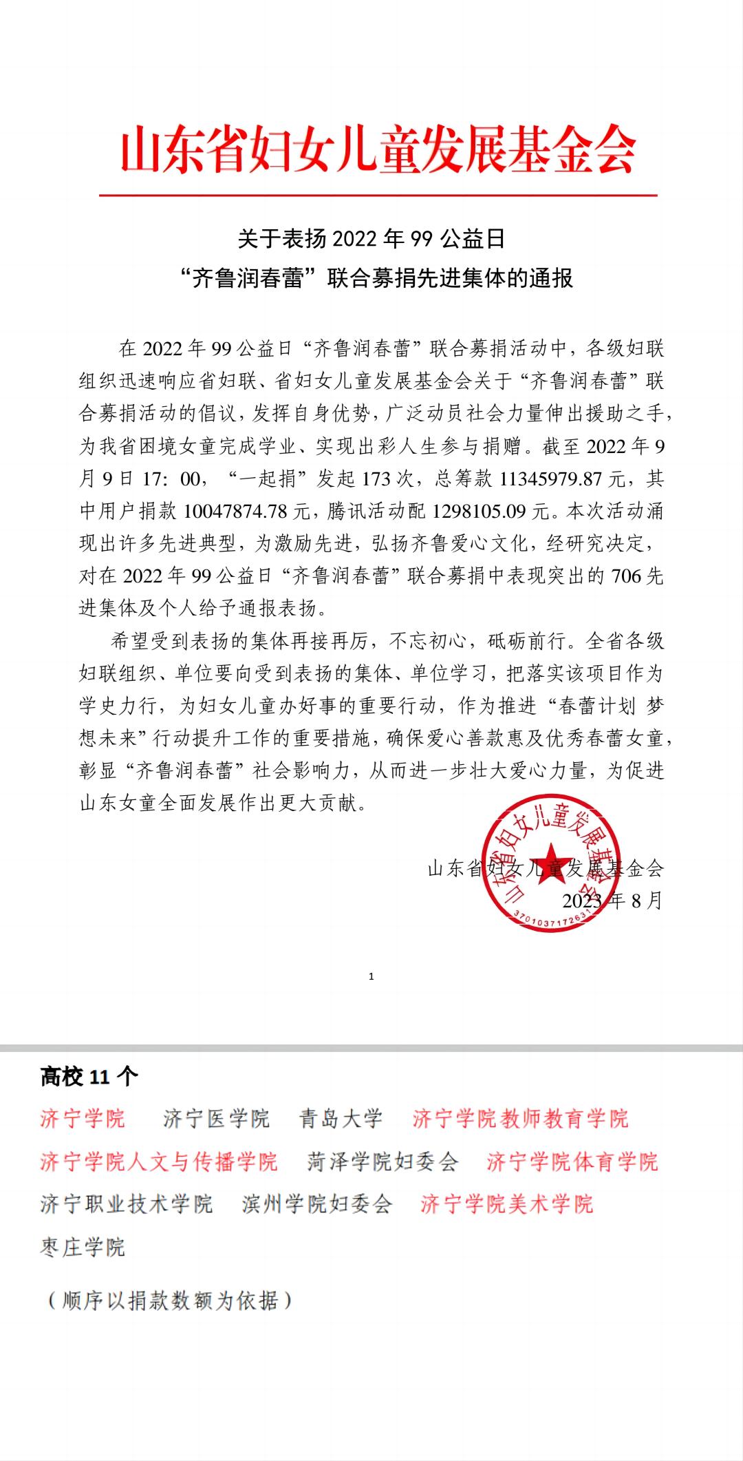 2023年8月,山东省妇联、山东省妇女儿童发展基金会对2022年99公益日“齐鲁润春蕾”联合募捐工作先进集体进行通报表扬。我校及教师教育学院、人文与传播学院、体育学院、美术学院在山东省“齐鲁润春蕾”联合募捐活动中表现突出荣获5个省级先进集体,在全省高校自筹募捐金额中排位第一名,四个二级学院进入前十名。