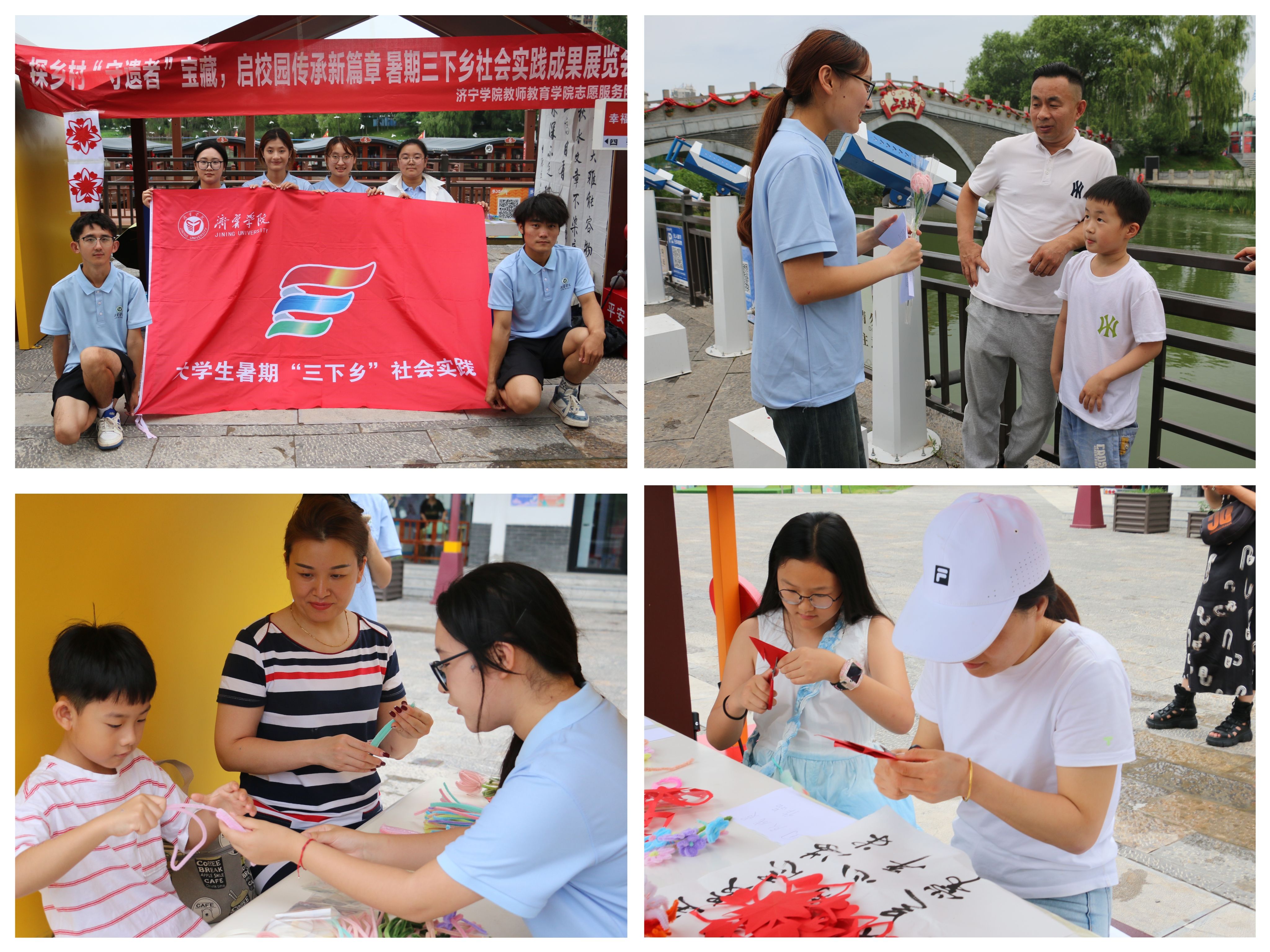 为扩大非遗文化的社会影响力,团队在曲阜市蓼河古街举办了实践成果展示会。现场集中展出了非遗传承人、实践队员及小学生的优秀作品,并设置了互动体验区,吸引了众多市民和游客驻足观看与参与体验。从参与者专注的尝试到观众由衷的赞叹,生动展现了非遗融入当代生活的可能性与活力。