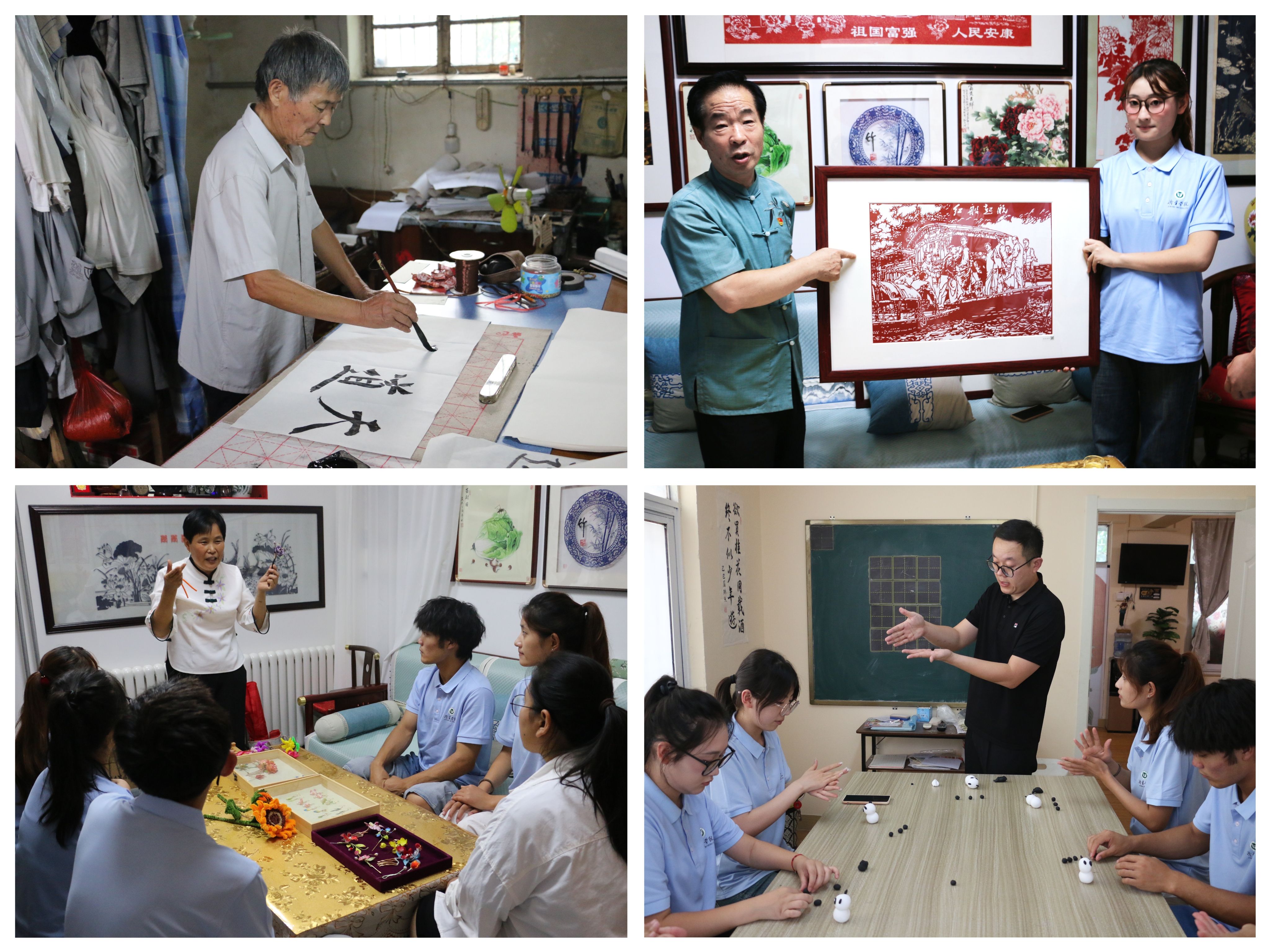 本次实践以“挖掘、传承、实践”为主线,聚焦书法、剪纸、绒花、面塑等优秀传统非遗技艺。团队走进济宁市邹城市张庄镇杨家庄村以及济宁市非物质文化遗产代表性项目传承人工作室,拜访了书法传承人段成岱、剪纸艺人张跃广、绒花匠人郑文花、面塑大师李恒辉等代表性非遗文化“守遗人”。段成岱挥毫泼墨间,将数十年临池不辍的坚守融入书法发展史的讲述,让队员们在笔墨香中感悟“字如其人”的文化风骨;张跃广以“红船起航”“时代楷模”等作品为媒,既详解了剪纸技艺三千年的演变,更用巧夺天工的剪刻展现了红色精神与爱国情怀如何在红纸间流淌;郑文花指尖翻飞,在“勾条”“打尖”等技法演示中,蚕丝绒渐次绽放成花,她细数绒花从唐代宫廷到民间的流转,指导队员协作创作,让雅致非遗在互动中焕发生机;李恒辉则以掌心温度赋予面团灵魂,捏揉搓压间,历史人物、民俗百态跃然指尖,两千年传承的技艺魅力令众人惊叹。实践中,队员们沉浸式学习非遗技艺,系统记录技艺细节与传承故事,初步建立了相关非遗项目的传承档案,为濒临消逝的非遗文化留下宝贵记录。